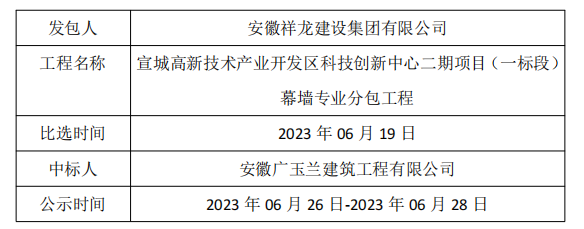 科創(chuàng)二期項目(一標(biāo)段)幕墻專業(yè)分包工程中標(biāo)公示