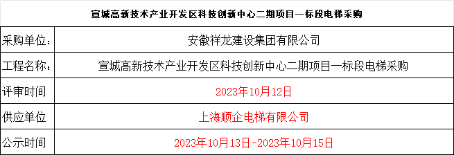 宣城高新技術產業開發區科技創新中心二期項目一標段電梯采購結果公示