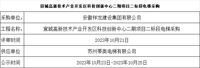 宣城高新技術產業(yè)開發(fā)區(qū)科技創(chuàng)新中心二期項目二標段電梯采購結果公示